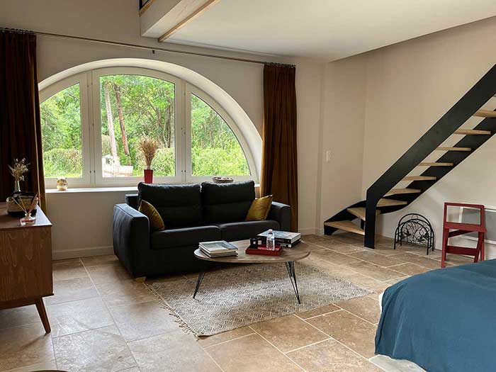 Charmant duplex pour un couple avec espace détente salon comprenant une cafetière espresso et à l'étage une chambre de 15 m2 avec sa salle de bain douche à l'italienne, du linge de toilette et de piscine.